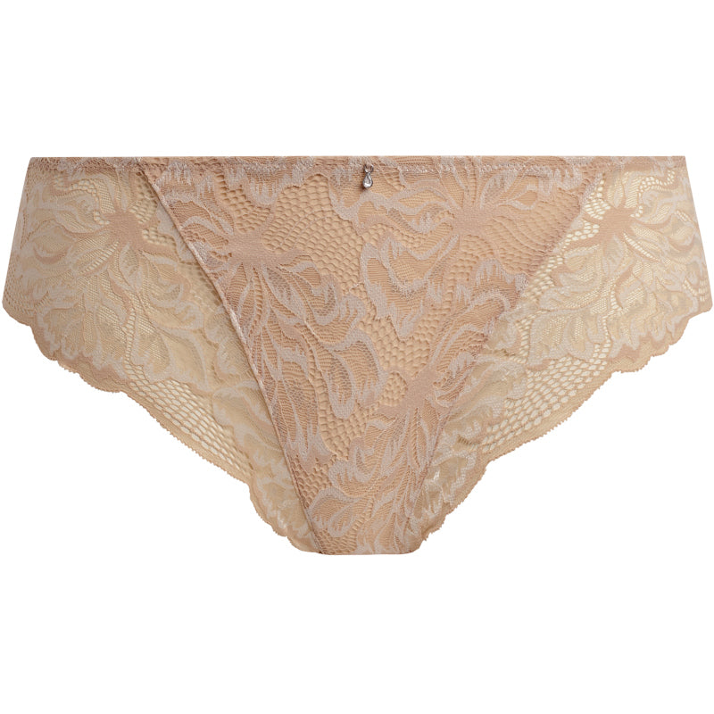 Discover everyday elegance with the Fantasie Emmaline Natural Beige Nude Brief. A mid-rise classic brief in soft nude-beige featuring delicate multi-tone floral lace across the front panel. Made from ultra-soft fabric for a luxurious, second-skin feel, it provides moderate coverage with a seamless, stitch-free back to ensure no visible panty lines under clothing, plus a subtle diamanté tear drop charm at the centre front for a hint of sparkle. Comfortable, flattering, and beautifully detailed, this brief is the perfect foundation piece—pair it with coordinating Emmaline Natural Beige Nude bras for a sophisticated, romantic lingerie ensemble.