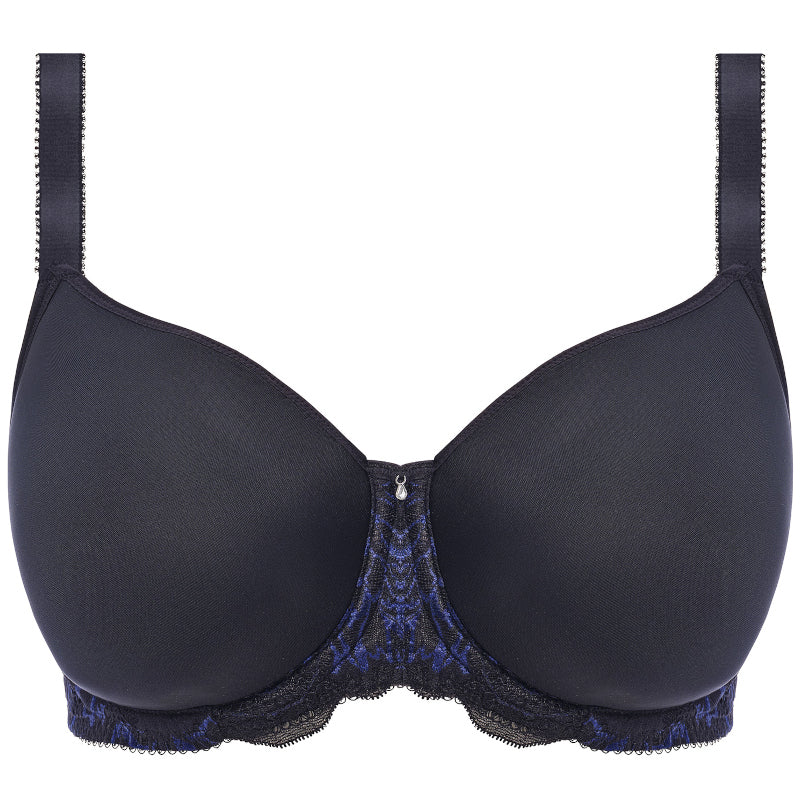 Experience seamless sophistication with the Fantasie Emmaline Midnight Underwired Moulded Spacer Bra. A breathable T-shirt bra in elegant black with multi-tone French navy floral lace accents for subtle luxury. Lightweight spacer fabric moulded cups deliver a natural rounded shape and full coverage without added bulk, while the wide wired frame, flexible neck edge, smoothing back lace wing panel, and inner wing anchorage ensure all-day comfort and reliable support for fuller busts. Centre pull straps prevent slippage, and a sparkling diamanté tear drop charm adds a glamorous touch—ideal for invisible wear under fitted tops. Pair it with matching Emmaline Midnight pieces for a coordinated, confidence-boosting lingerie set.