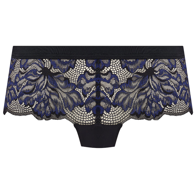 Discover luxurious comfort in the Fantasie Emmaline Midnight Short. A beautifully crafted mid-rise brief that pairs timeless elegance with everyday wearability. Featuring delicate multi-tone French navy floral lace front and back on a sleek black base, this short offers flattering full coverage with a soft, non-dig waistband and smooth leg lines for an invisible finish under clothing. The super-soft fabrics ensure all-day comfort, while the romantic lace detailing adds a touch of sophistication. Perfect for co-ordinating with the Emmaline Midnight bra or chemise to complete a stunning lingerie set.