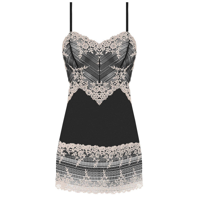 Drift into luxurious relaxation with the Wacoal Embrace Lace chemise in timeless black. Crafted from sheer fine mesh with signature two-tone floral stretch lace adorning the bodice and scalloped hem, this mid-thigh length slip offers an alluring, lightweight silhouette that flatters every curve while ensuring breathable all-night comfort. Adjustable spaghetti straps provide a personalized fit, making it perfect for intimate evenings, serene lounging, or effortless sleep in sophisticated sensuality.