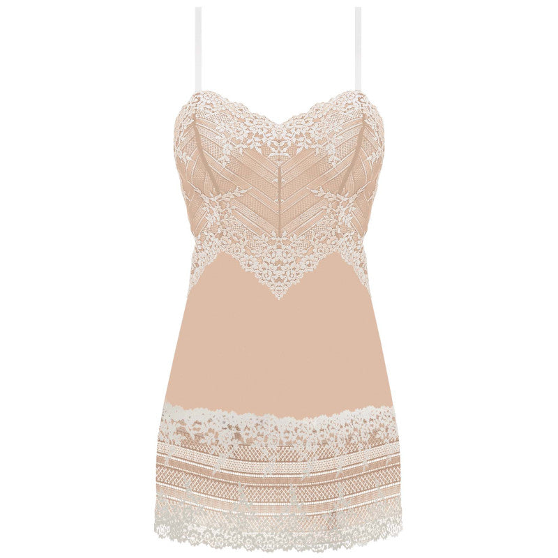 Drift into luxurious relaxation with the Wacoal Embrace Lace chemise in timeless naturally nude. Crafted from sheer fine mesh with signature two-tone floral stretch lace adorning the bodice and scalloped hem, this mid-thigh length slip offers an alluring, lightweight silhouette that flatters every curve while ensuring breathable all-night comfort. Adjustable spaghetti straps provide a personalized fit, making it perfect for intimate evenings, serene lounging, or effortless sleep in sophisticated sensuality.