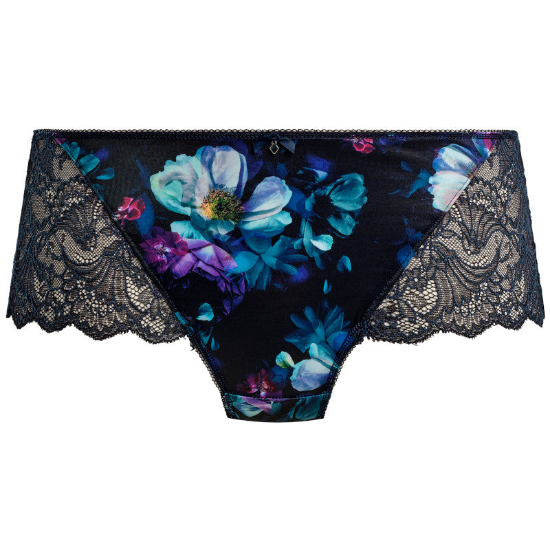 The Lucia Midnight short by Fantasie Lingerie features a rich dark sapphire base adorned with cascading floral patterns in icy blue, deep purple, and lilac, creating a sophisticated and romantic look.