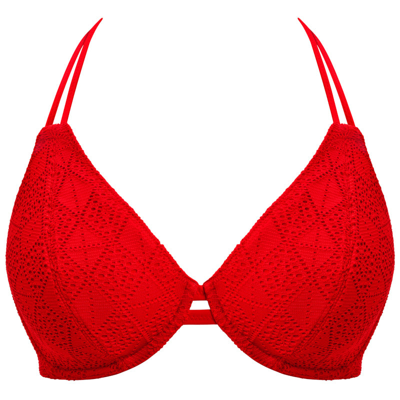 Elevate your beachside look with the Nomad Nights Lava Halter Bikini Top from Freya Swimwear. A bold and captivating piece that blends bohemian charm with exceptional support for fuller busts. Crafted in a striking lava red hue, this halter top features a flirty low plunging neckline that delivers enhanced cleavage and lift, paired with a textured crochet overlay for that irresistible boho vibe. Underwired cups (with no cradle for reduced coverage) are lined with powernet for beautiful shaping and reliable all-day support, while lightly padded foam ensures seamless comfort without bulk. Narrow adjustable halter ties allow a customizable fit, finished with decorative cream beads and gold-colored metal trims for a touch of luxe detail.