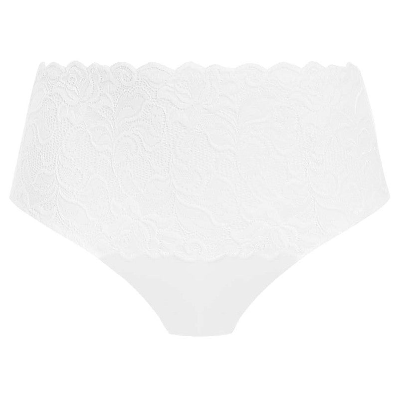 - Stretch lace front panel with scallop at waistline maintains comfort and reduces binding